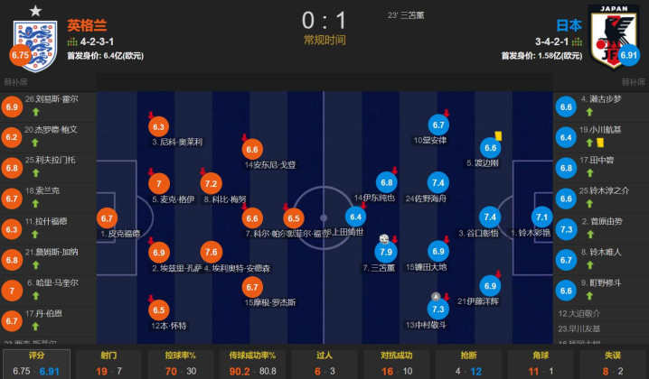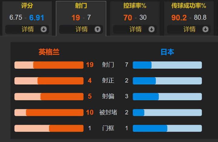 英格兰的控球率为70%,一共有19次射门,其中仅有4次射正;日本一共有7次射门,其中2次射正。