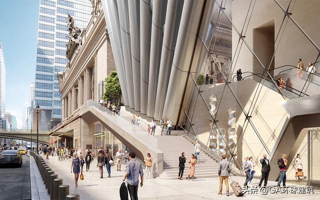 SOM方面解释,这些钢柱在地下灵活穿梭,绕过多层地铁线路,最终锚定在有限的基岩上。到了街道层面,钢柱交织成两束,尽可能退让地块红线,以此拓宽人行道,改善中央车站外的通行条件。