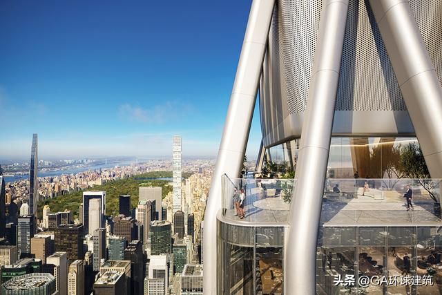 在高区退台处,倾斜钢柱下方隐藏着户外休闲空间,建筑内部则几乎不见承重柱的踪影。近500米的绝对高度,足以让到访者饱览震撼的空中景致。