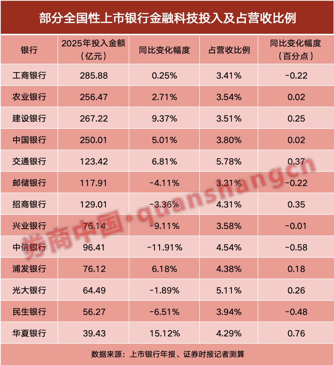 具体来看,工商银行以285.88亿元投入稳居首位,建设银行(267.22亿元)、农业银行(256.47亿元)、中国银行(250.01亿元)紧随其后,四家银行投入金额均突破250亿元关口。在2024年巨额投入基础上,5家国有大行2025年投入规模同比实现增长,4家投入金额占营收比例进一步提升。其中,建行、交行和中行投入金额同比增速分别为9.37%、6.81%和5.01%。